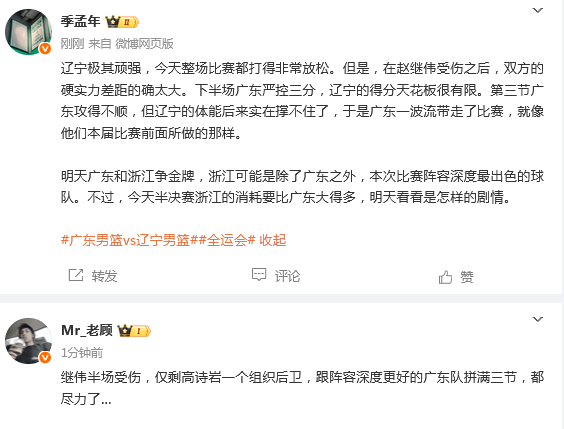 记者“”发文点评:“辽宁极其顽强,今天整场比赛都打得非常放松。但是,在赵继伟受伤之后,双方的硬实力差距的确太大。下半场广东严控三分,辽宁的得分天花板很有限。第三节广东攻得不顺,但辽宁的体能后来实在撑不住了,于是广东一波流带走了比赛,就像他们本届比赛前面所做的那样。
