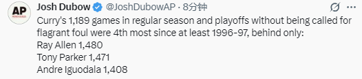 数据显示,自1996-97赛季以来,库里连续1189场零恶犯能排在第4位,在他前面的是雷-阿伦(连续1480场)、托尼-帕克(1471场)以及库里的前队友伊戈达拉(1408场)。