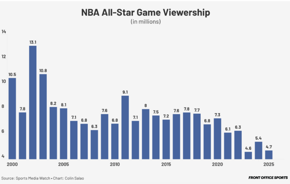 全明星为什么要改革?看看下面这张图你就知道了。2025年NBA全明星正赛,在TNT的平均观众人数仅有470万,比2024年下降13%。这是NBA史上收视率第二低的全明星,仅高于2023年的460万。跟20年前相比,差不多少了一半。