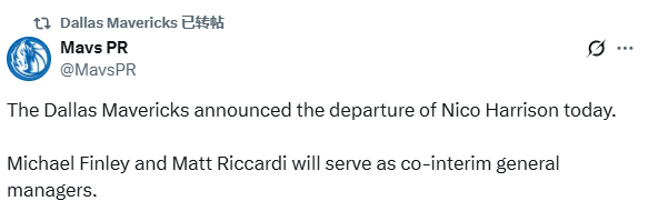 独行侠官方宣布解雇尼科-哈里森,官方公告写到:球队已正式解除尼科-哈里森的总经理及篮球运营总裁职务,即刻生效。