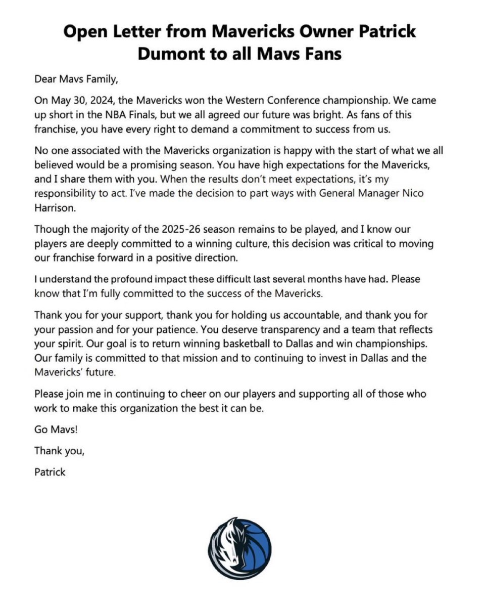 我们原本对这个赛季寄予厚望,但独行侠上下都无法接受这个糟糕的开局。你们对球队怀有崇高期待,我也有同样的期待。当结果未达预期时,采取行动是我的责任,我已决定与总经理尼科-哈里森分道扬镳。