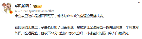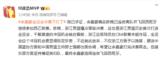 根据媒体人“付政浩”的爆料,我已求证,余嘉豪确实昨晚已连夜离队并飞回西班牙继续参加西乙联赛。昨晚,浙江男篮爆冷晋级决赛,这也是浙江男篮历史首次打进全运会,千载难逢的冲冠机会就在眼前,浙江这茬球员在CBA联赛未能夺冠,全运会这个冲冠机会更显得弥足珍贵,不应就此放弃,不仅浙江方面予以挽留,据说中国篮协方面和中国男篮主帅郭士强都出面协调,希望让余嘉豪打完决赛再走。但俱乐部方面坚持催促其归队,最终余嘉豪选择连夜飞回西班牙。