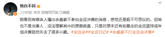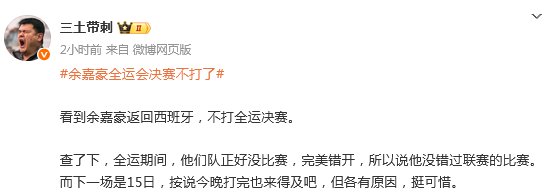 媒体人“三土带刺”发文点评:“全运期间,他们队正好没比赛,完美错开,所以说他没错过联赛的比赛。而下一场是15日,按说今晚打完也来得及吧,但各有原因,挺可惜。”