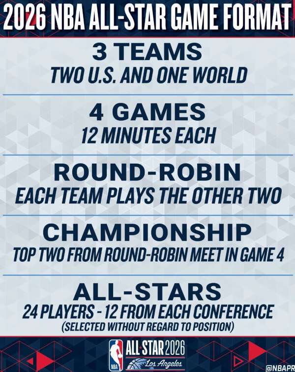 根据NBA官方公告,2026年全明星赛将于2月15日在快船新主场举行,采用前所未有的三队循环赛制:两支美国本土球员组成的球队将与一支国际球员组成的“世界联队”展开四节、每节12分钟的较量。每支球队至少配备8名球员,这意味着比赛将呈现更紧凑的轮换和更激烈的对抗。
