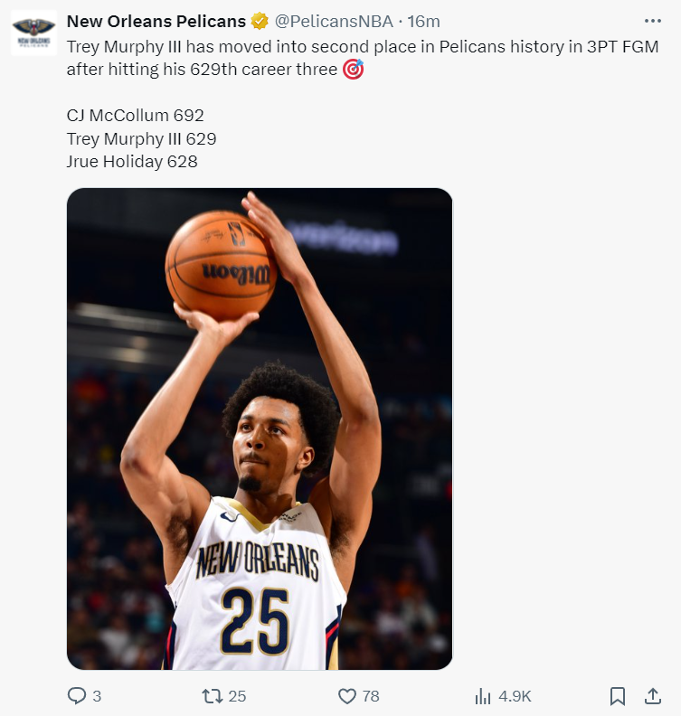 墨菲命中个人职业生涯第 629 记三分球,升至鹈鹕队史三分命中榜第二位。