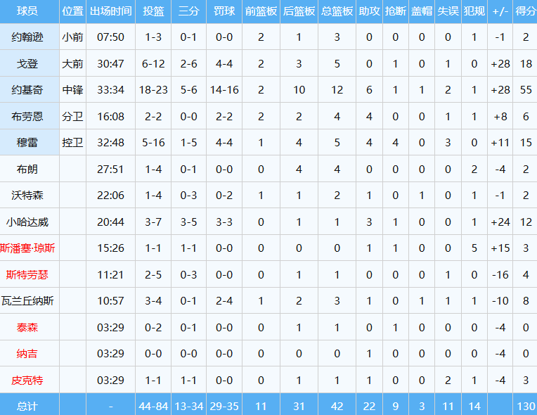 乖乖,约基奇投篮23中18,以高达约78%投篮命中率狂轰55分12板6助,带领掘金130-116取胜,对面的快船首发五虎加起来才54分。