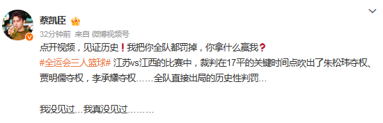 媒体人“LindaWooo”发文点评:“这在三人篮球赛场也是少见的场面了…… 江苏队朱松玮、贾明儒、李盛东和李承耀全部被夺权”
