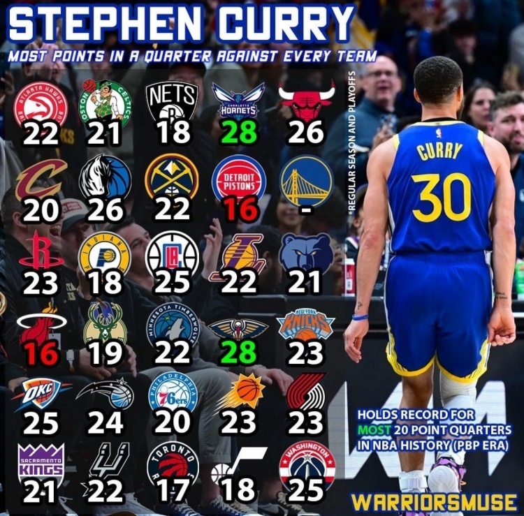 生涯至今,库里VS各队的单节最高分——打湖人、马刺、老鹰都是22分,打黄蜂、鹈鹕都是28分,打雷霆25分,打火箭23分,已经打22队有过单节20+表现。