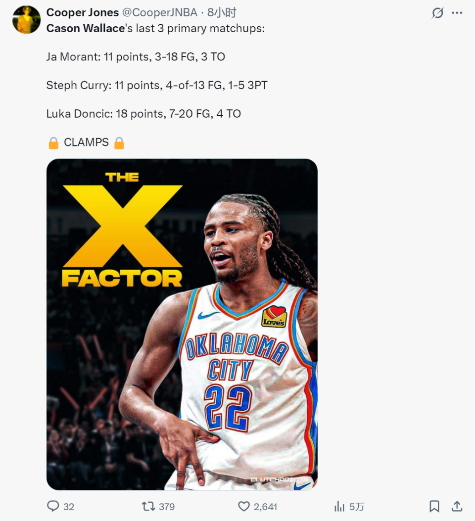 本赛季雷霆6名球员场均抢断超过1次:卡森-华莱士(2.3)、卡鲁索(2.1)、阿杰伊-米切尔(1.9)、亚历山大和哈滕(均是1.3)、多尔特(1)。过去3场比赛,卡森-华莱士对位莫兰特、库里和东契奇时,他们三个合计51投14中。