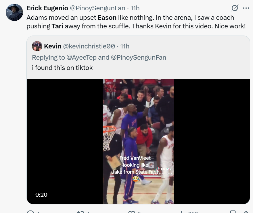 事件起因是一名现场观战的球迷在社媒转发亚当斯高光集锦的同时,询问有谁知道伊森与亚当斯两人之间因为什么发生了冲突?自己当时在现场看到亚当斯在与一名助教沟通后,直接推开后伊森,后者看起来气得够呛。