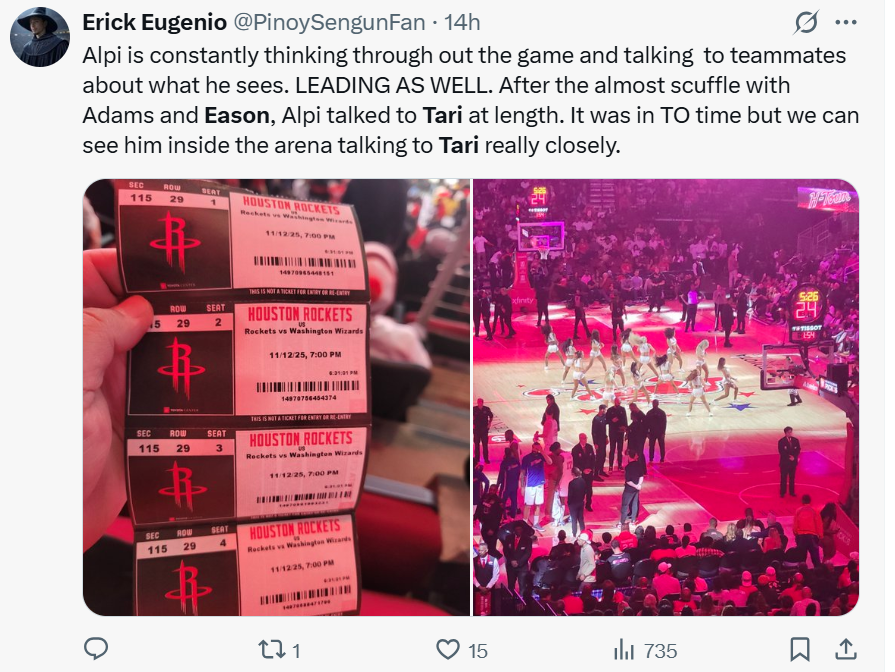 最初曝出这一次疑似内讧的球迷,也在社媒中晒出票根与现场照片,称赞了内线核心申京在这次突发事件中的表现,表示他不仅在场上很有领袖风范,场下也是如此。