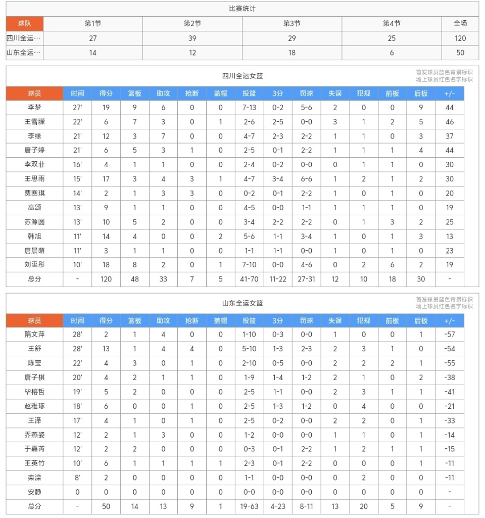 下半场第三节四川队明显在收着打了,毕竟优势那么大,而且实力占优,随着四川队防守的松懈,山东队获得了更多的得分机会,她们的进攻比上半场有好转,不过防守端山东依然吃力,王思雨、李梦、韩旭、刘禹彤随便打打,得分都上双了,四川队第三节继续扩大分差优势,取得胜利只是时间问题了!末节山东队得分都很困难了,她们消耗太大了,而四川队打了整场的车轮战,体能一点问题也没有,山东又经历了一波被压的过程,最终惨败收场!