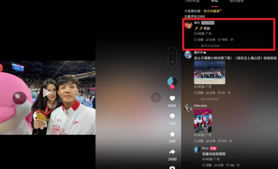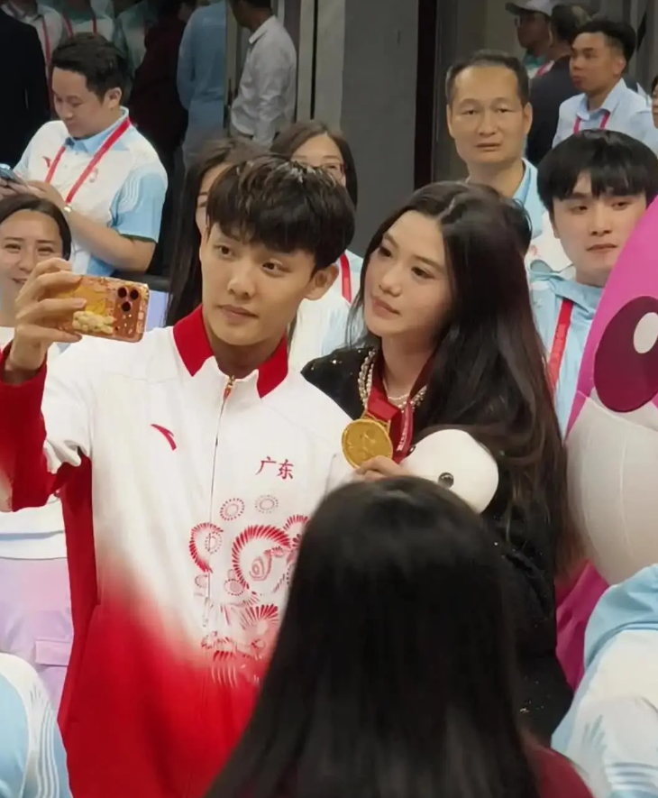 这次徐杰的女友直接现身全运会颁奖现场,颁奖仪式结束后,她脖子上挂的是徐杰的金牌,还与男友合影留念。
