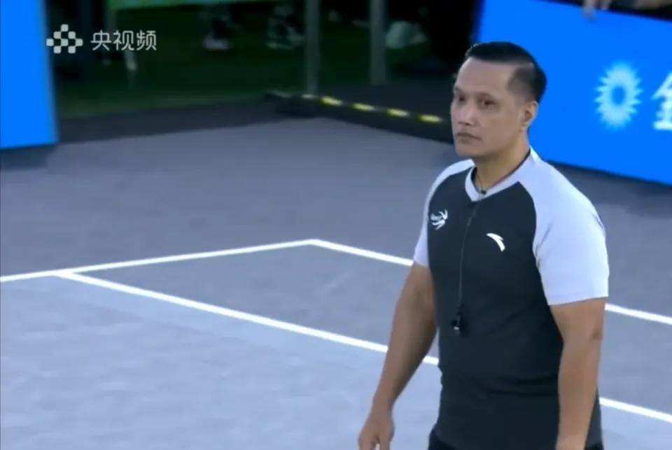 另外一个临场裁判试图阻拦外国裁判Donald Francis Quin镜头,但并没有阻拦成功,反而是外国裁判Donald Francis Quin走到另外一边直视贾明儒离开比赛场上。