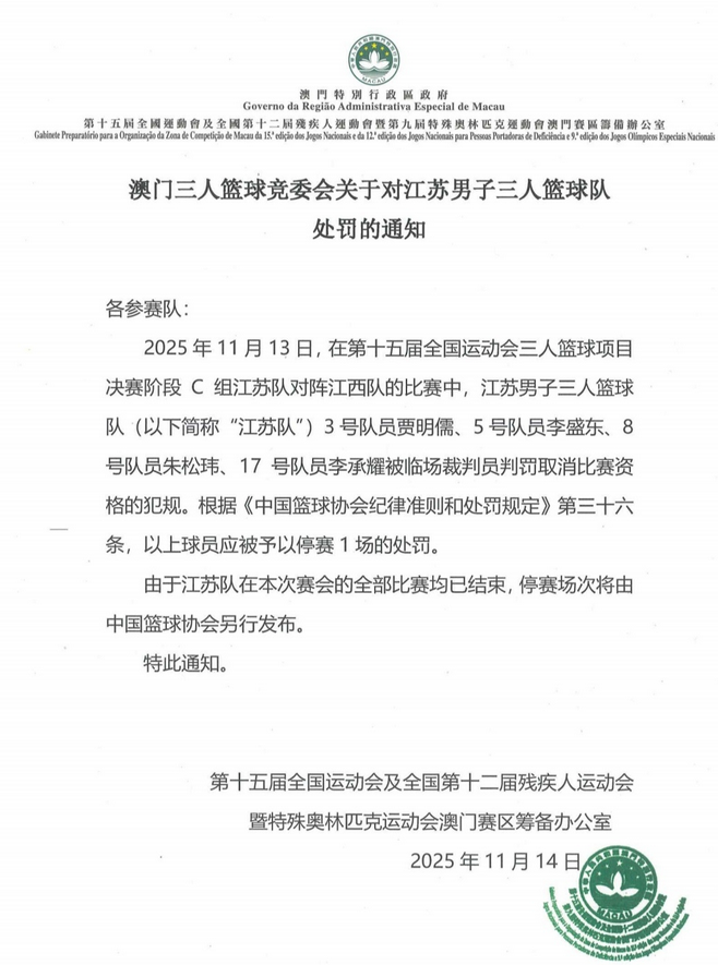 江苏全运三人男篮被判全队夺权离场后续:组委会对江苏队追加禁赛处罚