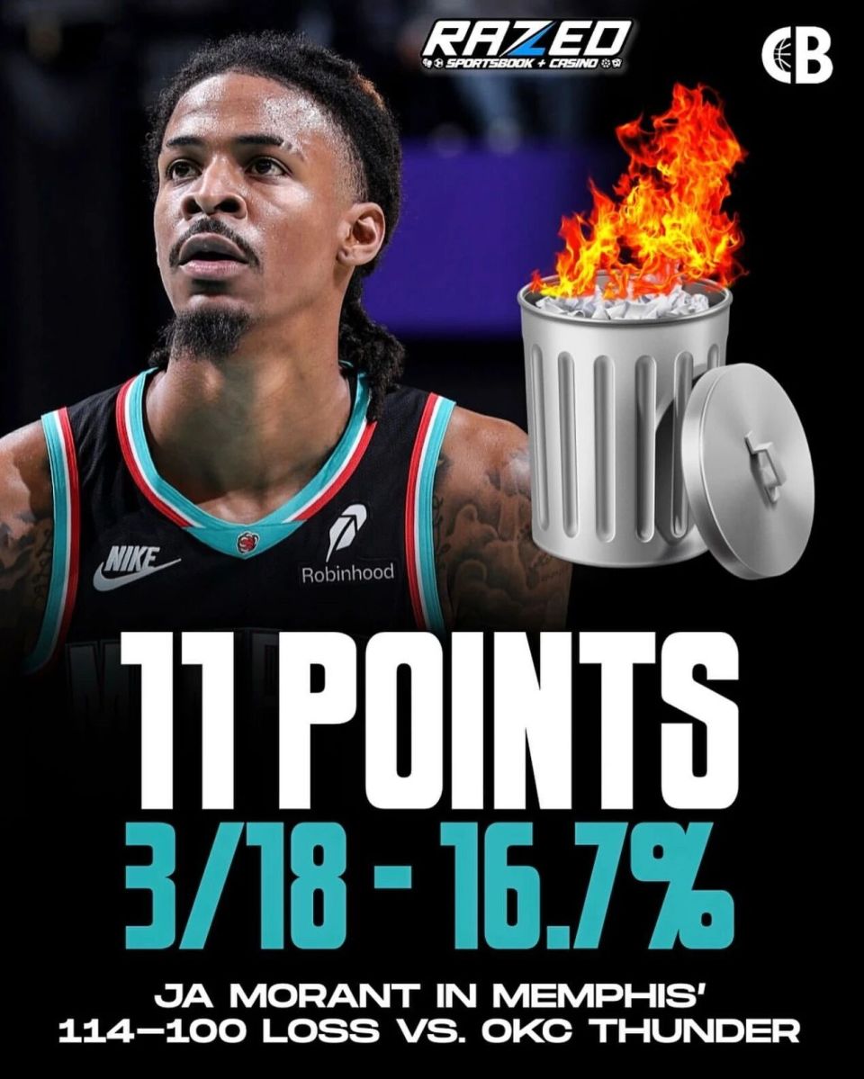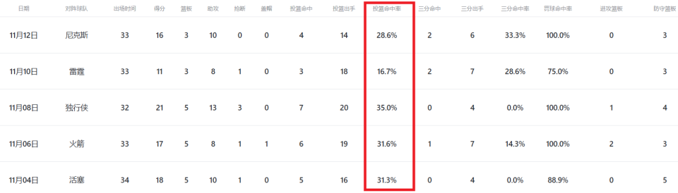 本月初,莫兰特因有损球队利益行为(和主帅伊萨洛对喷)被灰熊禁赛一场,复出之后的五场比赛表现不忍直视,最高的一场投篮命中率仅仅35%(20中7),最低的一场只有可怜的16.7%(18中3)。