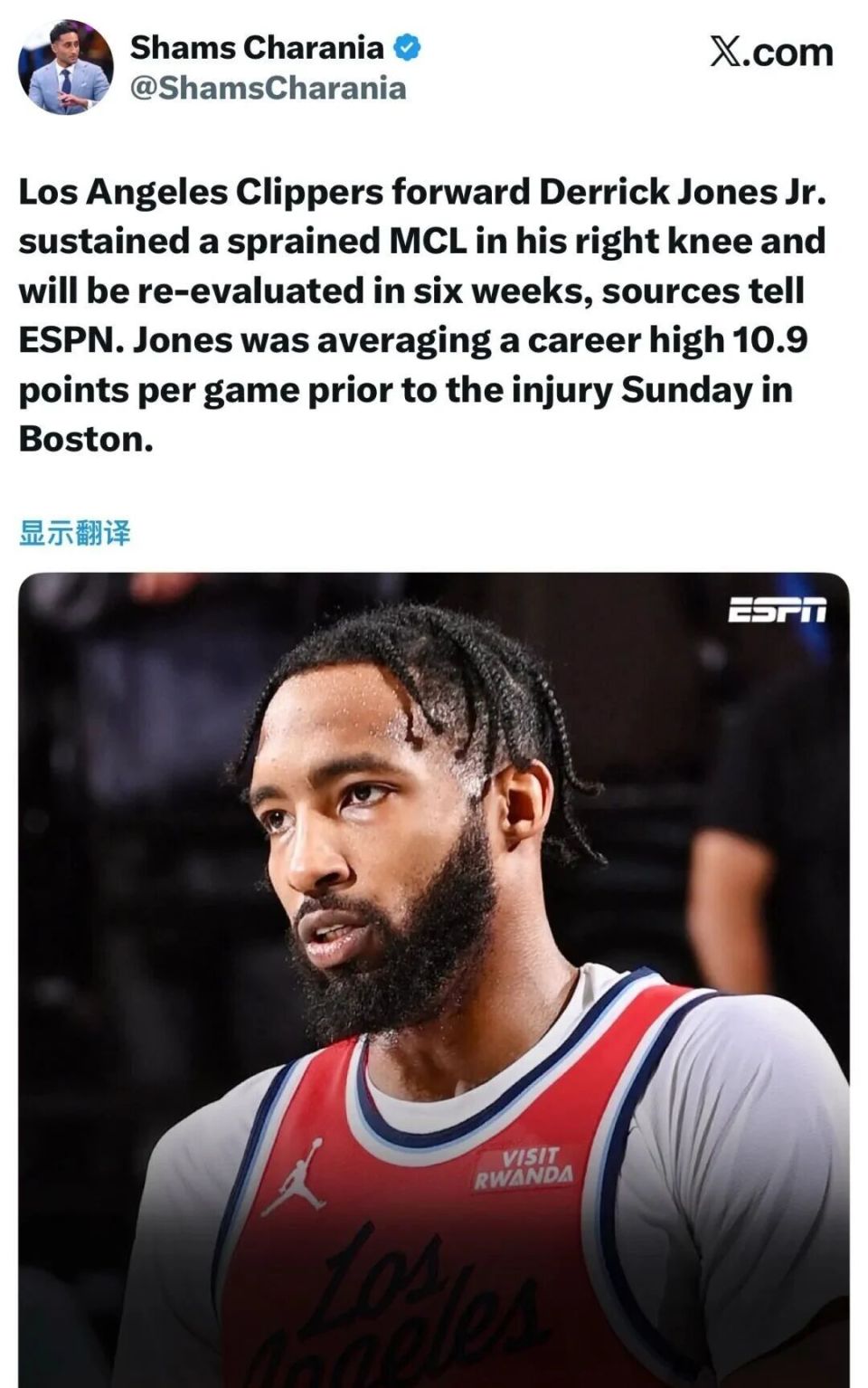 近日快船118-121惜败的比赛,杰伦布朗在扑球过程由于失去平衡砸到小琼斯的腿部,导致他出现了如上所述的重伤情况。