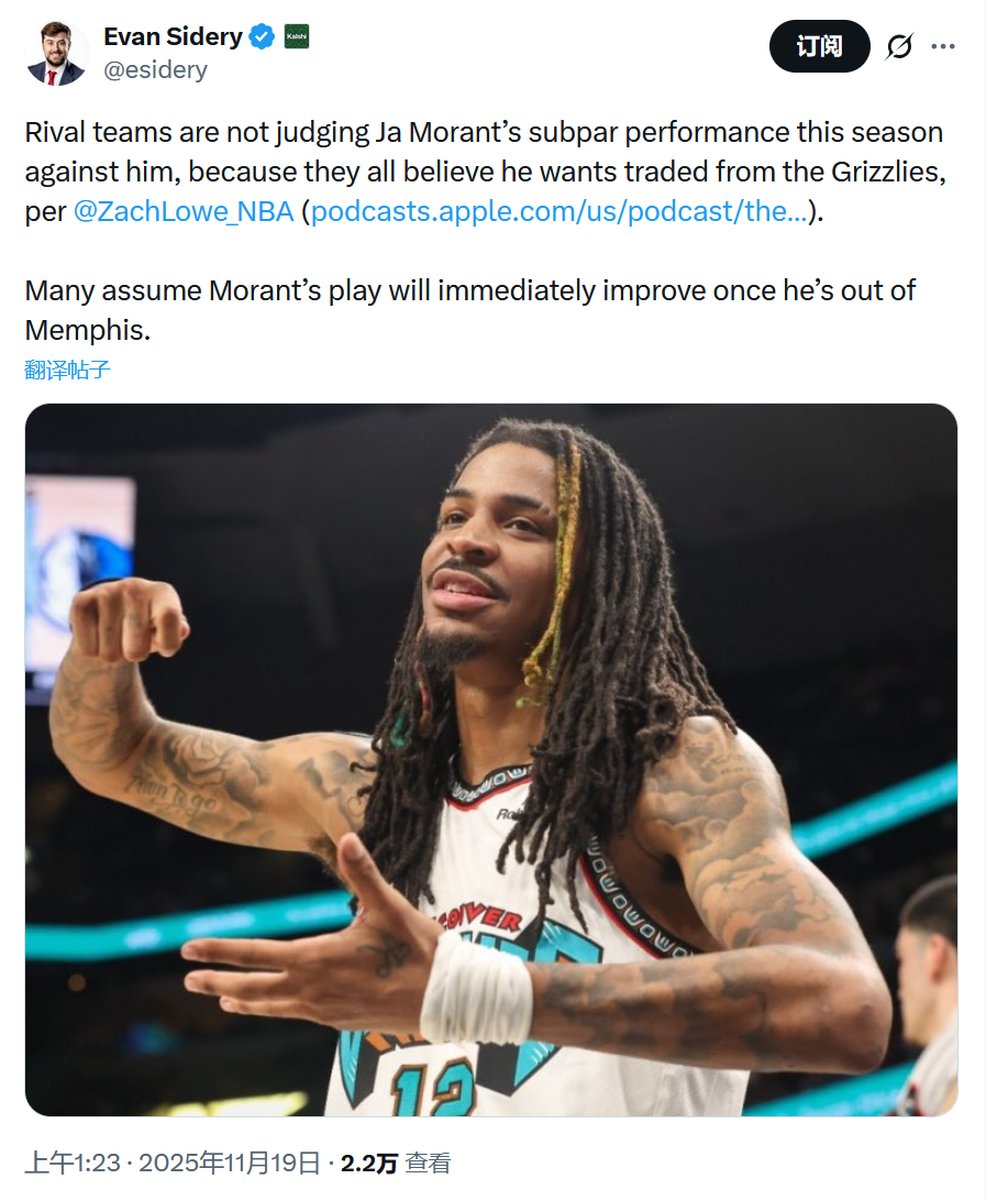 北京时间11月19日,NBA常规赛继续进行。在谈到灰熊队球星莫兰特的交易前景时,名记Zach Lowe表示,各支球队会无视莫兰特近期的糟糕表现,因为已经默认他去意已决。