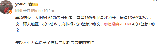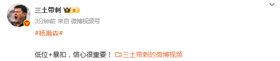 媒体人周鹏发文点评:八场之后再次有了轮换登场的机会,坦白讲这确实是到目前为止,瀚森在常规赛把握机会发挥最好的几分钟,积跬步,至千里,一步一步,越来越好。