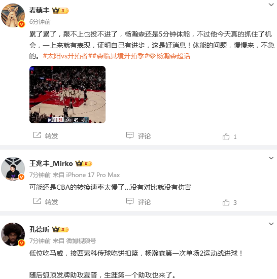 媒体人麦穗丰发文点评:“累了累了,跟不上也投不进了,杨瀚森还是5分钟体能,不过他今天真的抓住了机会,一上来就有表现,证明自己有进步,这是好消息!体能的问题,慢慢来,不急的。”