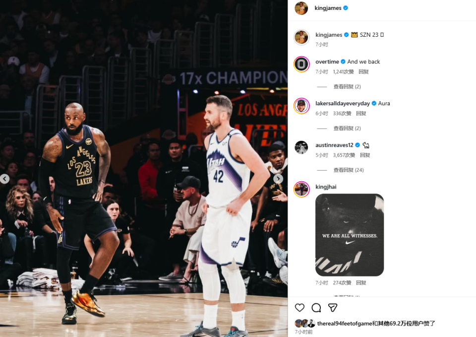 昨天詹姆斯晒高燃集锦庆祝复出,今日他连续晒出17张赛场照,继续庆祝开启第23年,晒出与东契奇同框、与海斯尽情庆祝、与前队友乐福同框的画面;老詹的庆祝动态又引热议,安东尼、乐福、特雷-杨和塔图姆等人为老詹点赞,湖人球员里夫斯和阿杜-蒂耶罗都在评论区留言:🐐(历史最佳Goat的谐音梗)。