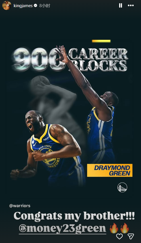 值得一提的是,詹姆斯在社媒上转发勇士官推庆祝追梦格林达成900次盖帽的海报,配文写道:恭喜我的兄弟!@格林。