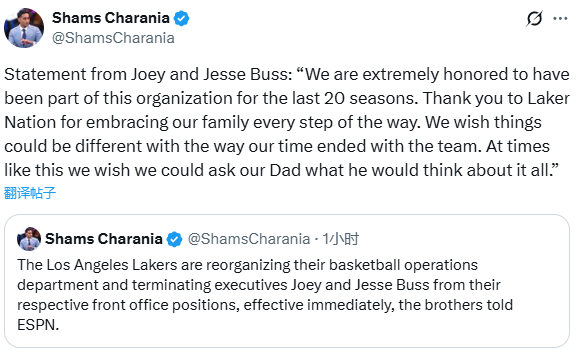 北京时间11月21日,据ESPN名记Shams报道,湖人重组篮球运营部门,正式解雇巴斯兄弟乔伊和杰西,他们声明称不该以这样的方式离开湖人。
