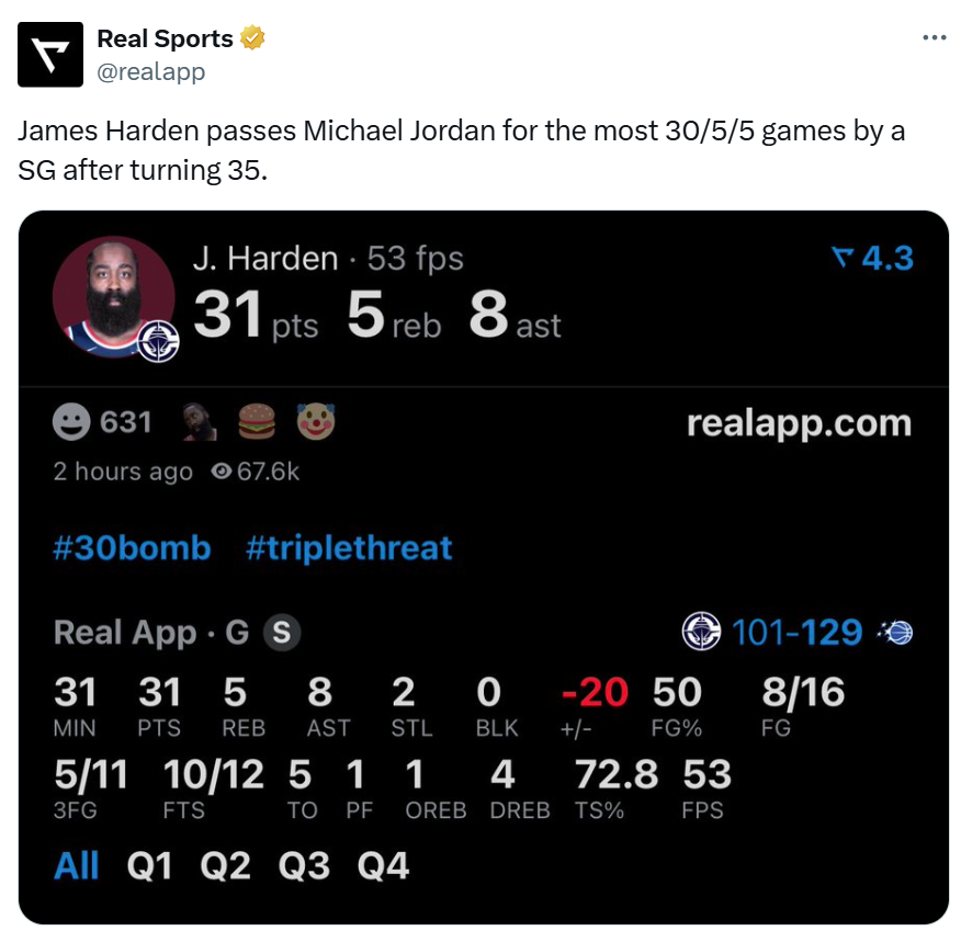更是一口气超越篮球之神乔丹,成为35岁之后单场轰下至少30+5+5场次最多的得分后卫。