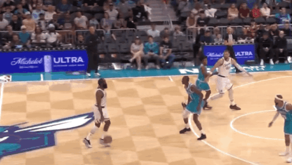 哈登先是造成犯规2罚全中,紧接着展示全面的得分能力,先是抛投打进,随后连续在中远距离投篮带来贡献,在短短的57秒时间里连得7分。