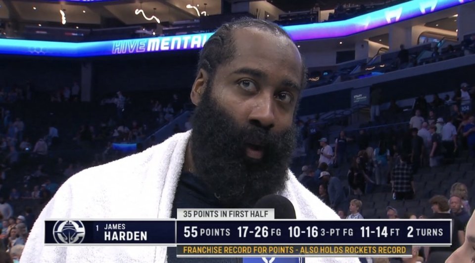 哈登狂飙55+7+10三分!单节轰27分击溃黄蜂 刷爆纪录比肩科比库里