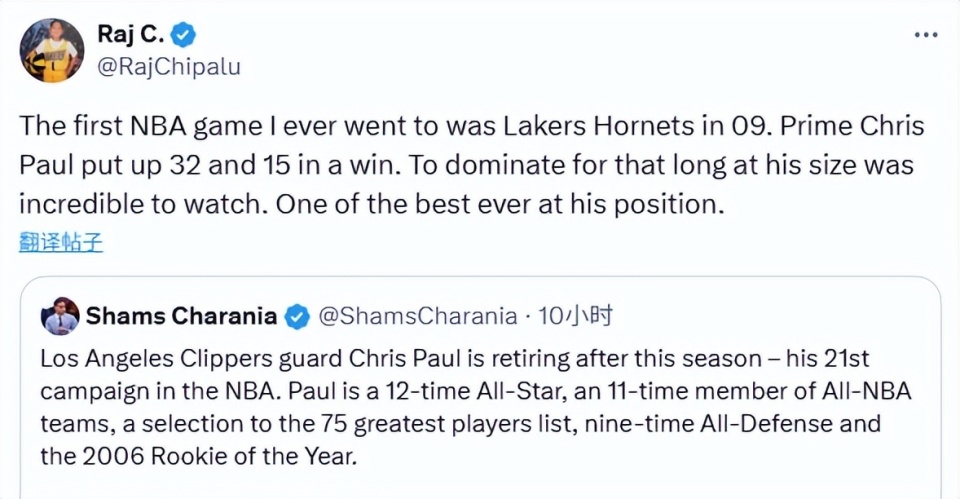 面对这名老将的退役,快船记者Jamal Cristopher发文称赞道:“他是篮球史上最伟大的球员之一,以他这样的身材达到这样的高度,能够与CP3真是我的荣幸。”