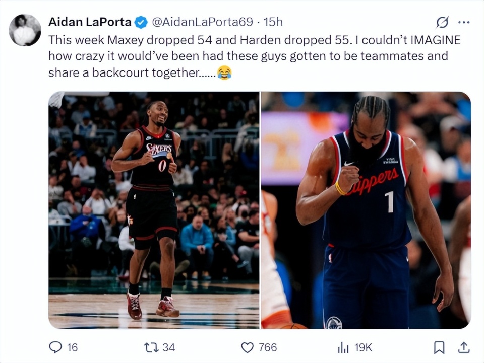 费记Aidan LaPorta:本周马克西砍下 54 分,哈登则拿下 55 分。我简直无法想象,如果这两位球员能成为队友并一起在后场打球,场面会有多么疯狂......哭笑不得。