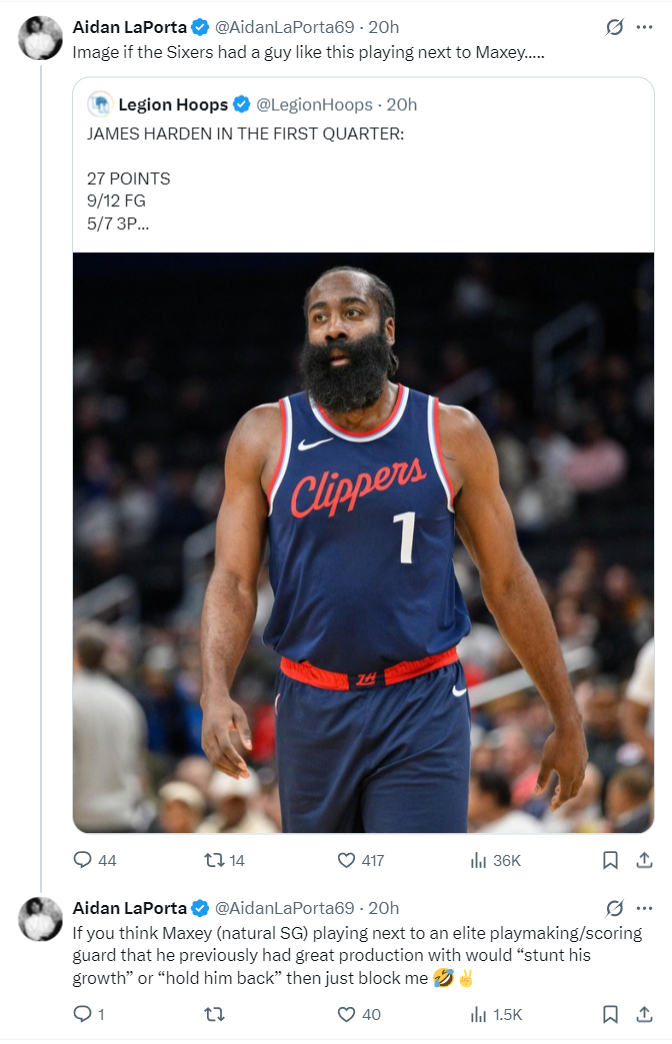 在哈登首节拿到27分后,费城记者Aidan LaPorta写道:居然有人觉得马克西与一位有着出色合作表现的顶级组织者/得分手搭档会阻碍他的成长、限制他的发展,真可笑。你们应该想象一下,马克西如果跟本赛季的哈登一同征战是什么样的场景。