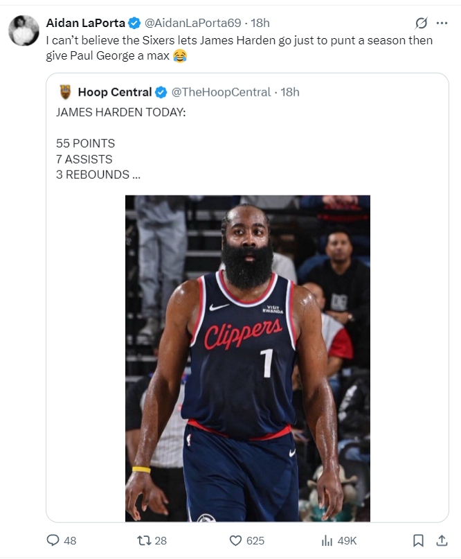 费城记者Aidan LaPorta在哈登拿到55分后写道:我简直不敢回想,费城竟然让哈登离开,然后用四年2.12亿的顶薪签下保罗-乔治。