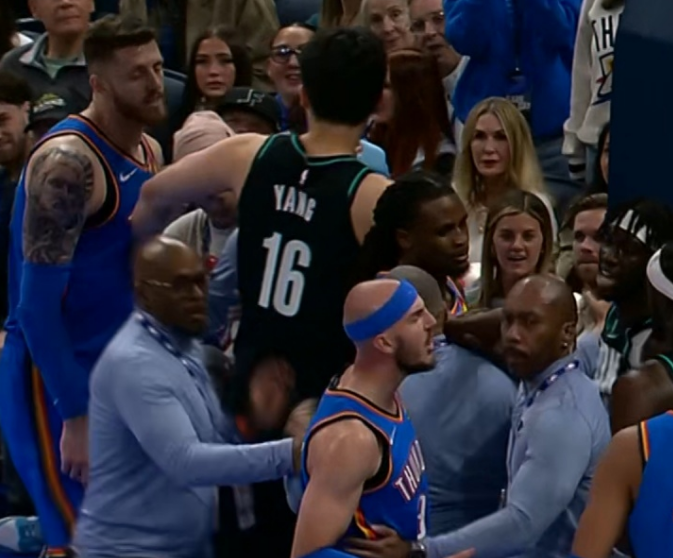 在第二节比赛前半段,吕佩尔左手拉拽米切尔的球衣,哈尔滕施泰因认为吕佩尔的动作太大爆发口角冲突,双方球员立即过来劝架。杨瀚森从身后拉走暴怒的哈尔滕施泰因,裁判吹罚吕佩尔一级恶意犯规,哈尔滕施泰因则是被吹罚技术犯规。