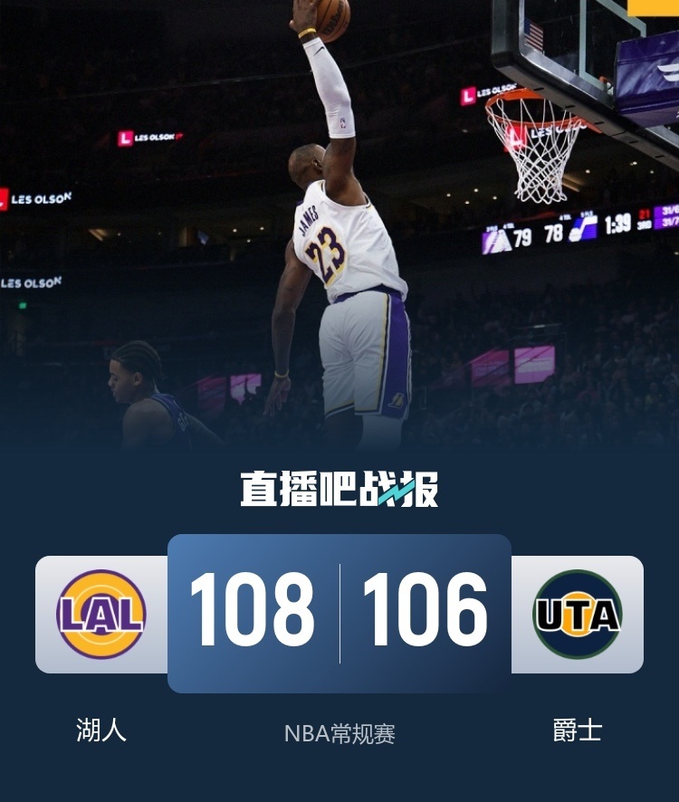 易边再战后艾顿伤退,乔治发力单节独揽13分,爵士一波11-0实现反超,詹姆斯反击暴扣止颓,三节结束后湖人守住3分优势,末节决战,湖人连造杀伤拉开比分,决胜时刻爵士一波12-4拉回悬念,东契奇两罚中一后爵士绝杀未果,最终湖人108-106再胜对手迎4连胜,反超掘金升至西部第二,同时送给爵士4连败。