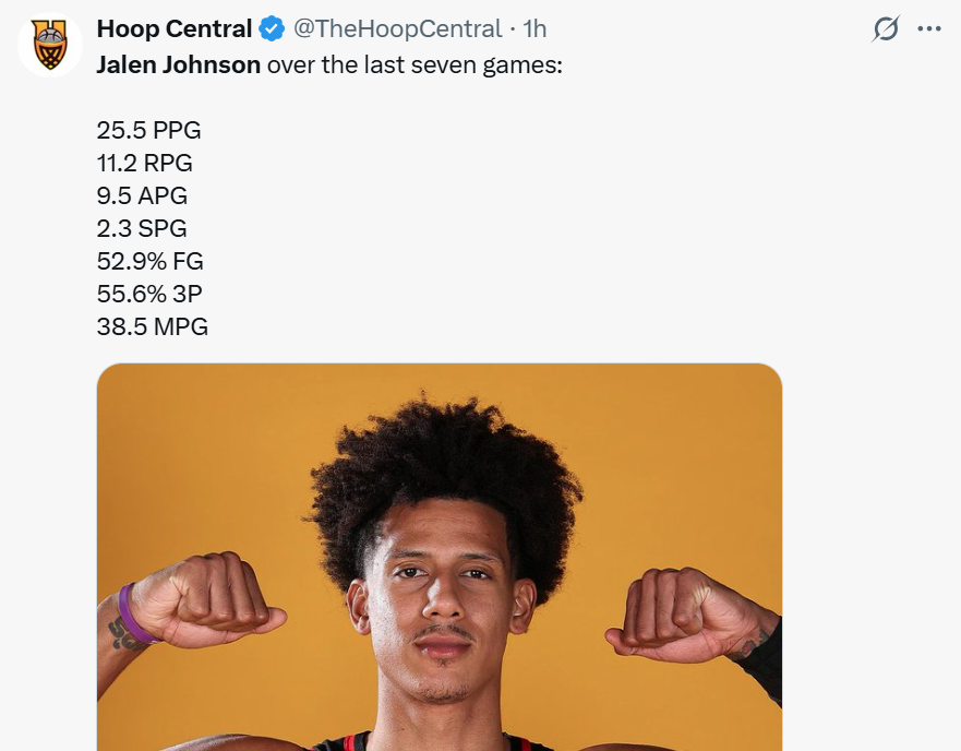 而这也是特雷杨缺席后,杰伦约翰逊整体傲人表现的缩影,尤其是过去7场比赛,杰伦约翰逊的表现持续提升。