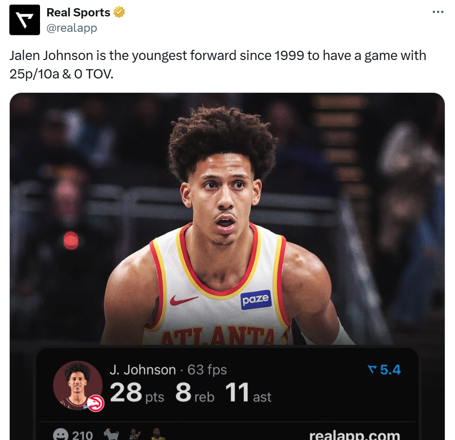 凭借这样的表现,23岁的杰伦约翰逊成为1999年以来NBA单场拿到至少25分10助0失误最年轻的锋线。