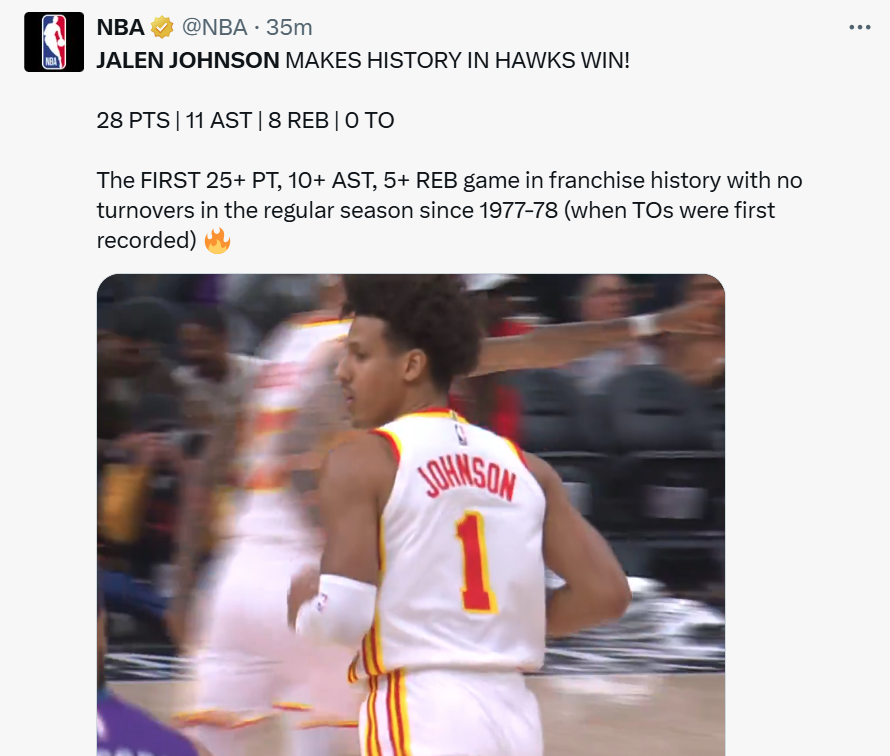 同时杰伦约翰逊打破一项尘封47年之久的纪录,成为77-78赛季NBA开始记录失误数据以来,老鹰队史首位在常规赛拿到至少25分10助攻5篮板,同时0失误的球员。