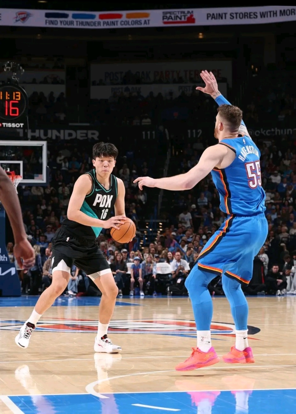 比赛进入第二节,他在外线弧顶位置接球后果断出手,皮球应声入网——这是他在NBA常规赛命中的首记三分球!随后比赛中,他更是多次上演高光时刻:第四节先是背打雷霆中锋哈滕施泰因完成勾手2+1,随后与队友乐福完成空接暴扣,引得替补席一片沸腾。