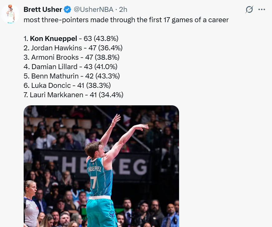 本场命中7记三分后,克努佩尔开季17场比赛已经命中63记三分,成为NBA历史上生涯前17场比赛命中三分数最多的球员。