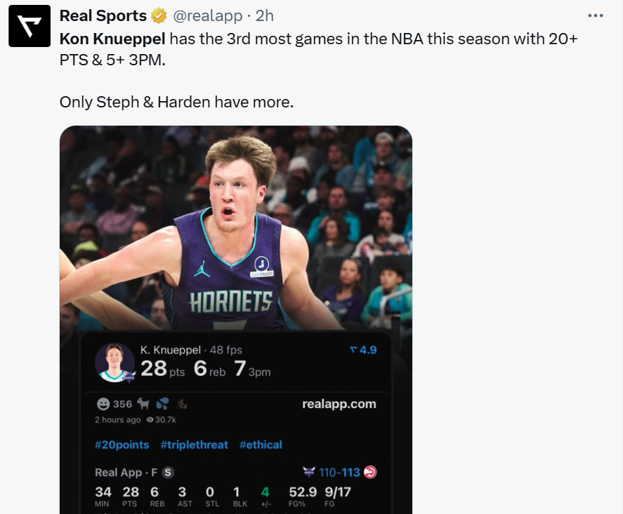 同时本场再次拿到20+得分,并且至少命中5记三分后,克努佩尔成为开季至今交出这一数据第三多的球员,仅次于哈登与库里两名历史级别巨星。