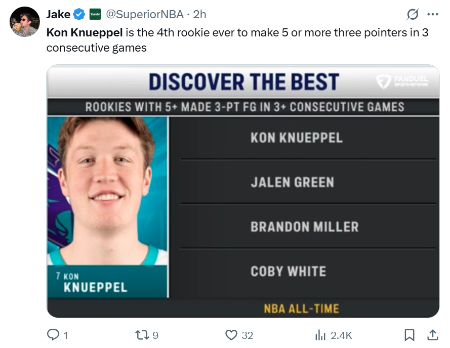 开季狂轰63记三分历史第一刷爆纪录,黄蜂4号秀克努佩尔真不得了!此前陷入交易传闻的三球也没必要辟谣了。