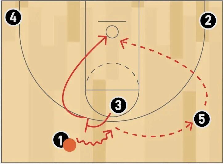 这套模式是传统挡拆的进阶版,在于球多传了一手,战术丰富了很多;当然难度也增加不少,需要1、3、5号位球员有不错的默契度,需要1、5号球员有不错的出球能力,需要强弱侧配合,能抓住瞬间的时机配合到位。