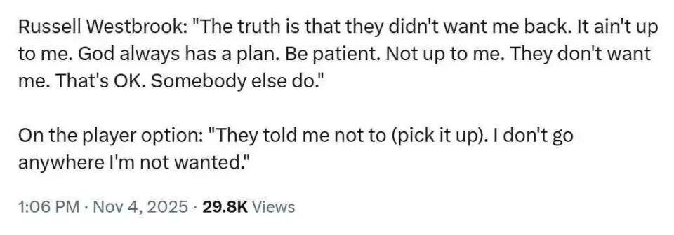 如上所述,威少在本赛季展现出了一定价值,倘若被裁掉沦为自由球员,大概率还会有新东家愿意将他收入麾下,甚至自行选择加盟一支自己喜欢的球队;被交易的话,就得祈祷能够被送至一支有竞争力的队伍;如果被交易到同样摆烂的球队,那还可以协商买断进入自由市场。