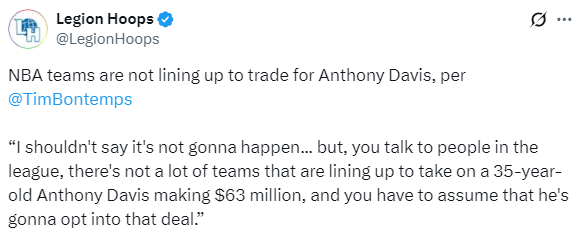 对于浓眉的交易行情,名记蒂姆-邦坦普斯报道,外界普遍存在一种思维定势,交易浓眉能换来一个首轮签,两个选秀互换权、两名年轻球员以及其他资产,可与联盟内部人士交流,现实情况是几乎没有球队愿意接手一个35岁、年薪6300万美元的安东尼·戴维斯,而且外界预判他必然会执行球员选项。