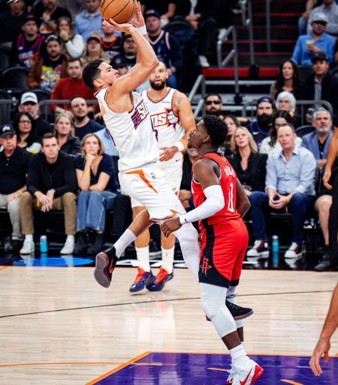 作为如今太阳队的绝对战术核心,布克的个人表现,在很大程度上决定了球队的发挥,非常清楚这一点的火箭,首节一上来就派几名防守球员轮番去消耗和限制布克,也取得预期的效果,在严防死守之下,布克远远没有打出自己的赛季平均水平,13次出手命中5球,只贡献了18分、3个篮板、5次助攻和1次抢断的个人数据,还出现了多达6次的失误。