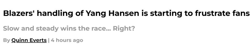 北京时间11月27日,开拓者队记Quinn Everts在最新文章中为杨瀚森鸣不平,认为斯普利特应该给这位16号秀更多的锻炼机会。以下是他的文章内容——