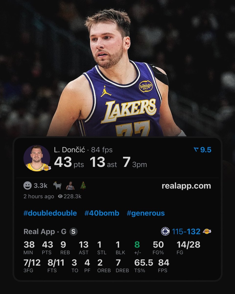 在本场比赛中,湖人队当家球星东契奇的表现太过于出色。全场比赛,东契奇出战38分16秒,投篮30中14,三分14中7,罚球11中8,得到43分9篮板13助攻1抢断1盖帽。他连续创造了多项纪录,在比赛结束之后,他被冲上了全美热搜第一的位置!