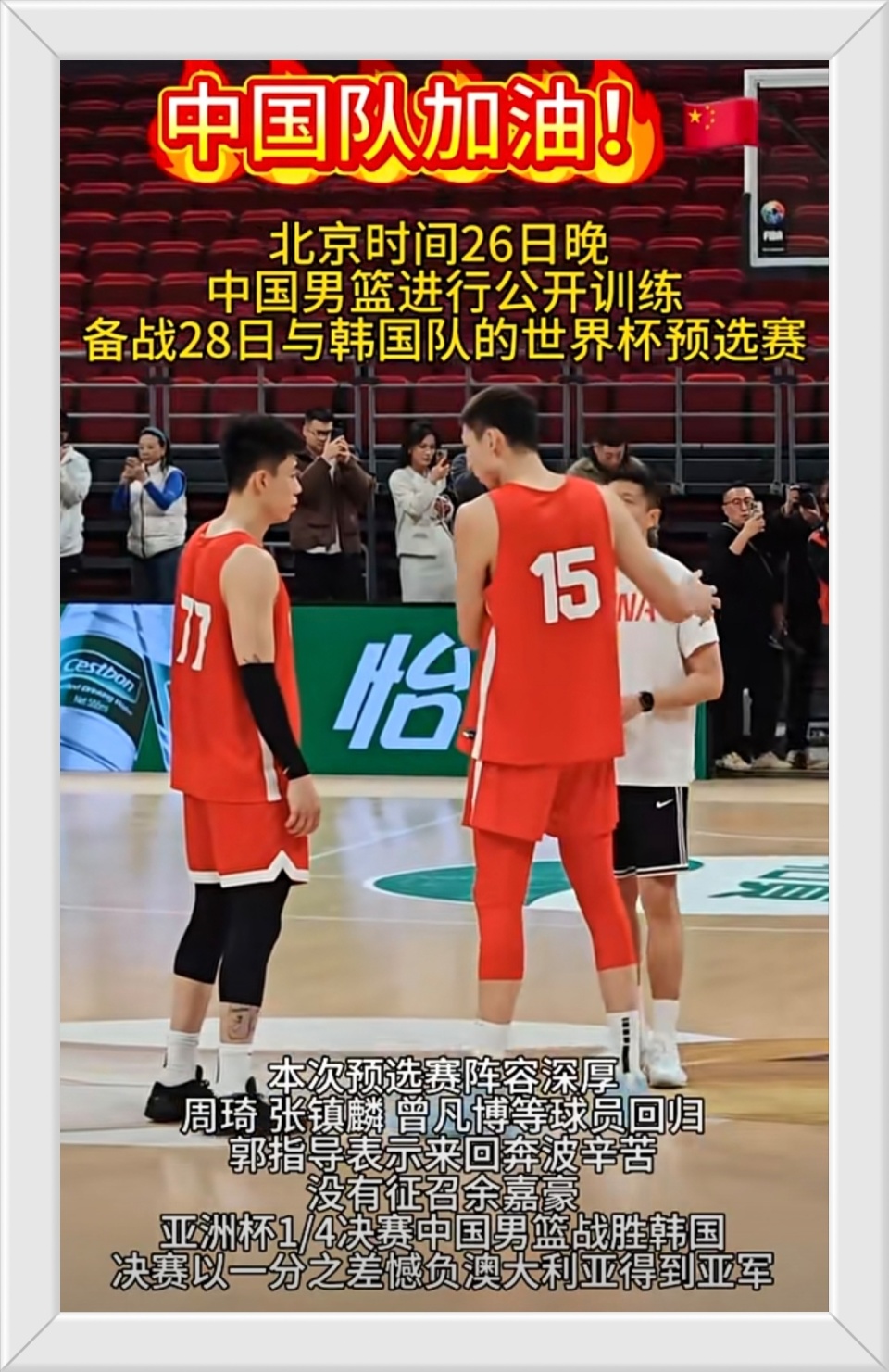 19点30!世预赛中国男篮vs韩国,郭士强表态!周琦指导张镇麟训练